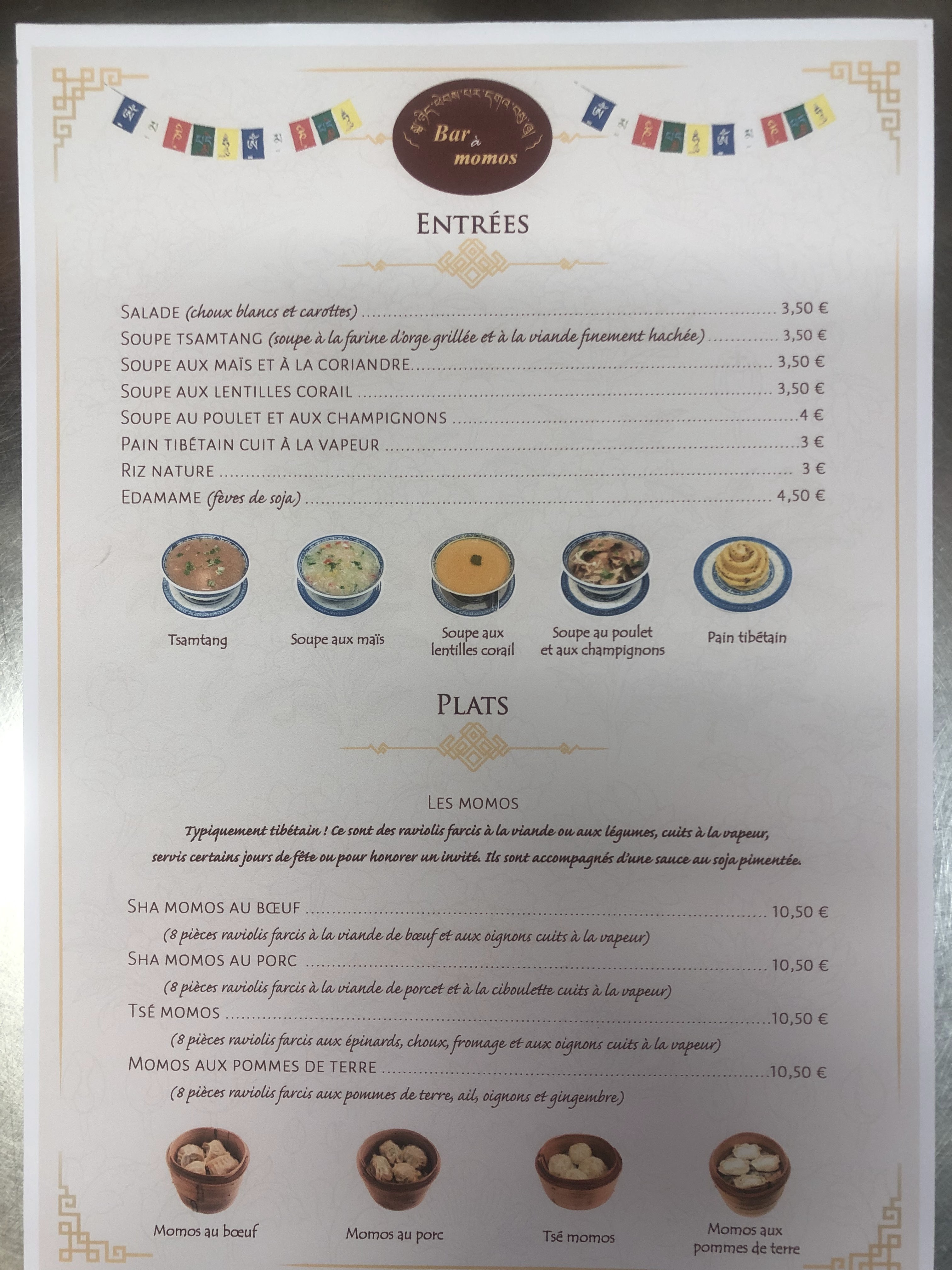 Nous sommes venus y manger à 6 dont deux jeunes enfants. Les soupes sont les mêmes que j'ai eu la chance de manger dans le nord de l'Inde près de la frontière tibétaine, et les momos végétariens (tse momos) sont très bons, réalisés à la commande par le cuisinier. Tous les arômes et les saveurs que j'avais tant aimé, je les ai retrouvés au Bar à Momos.