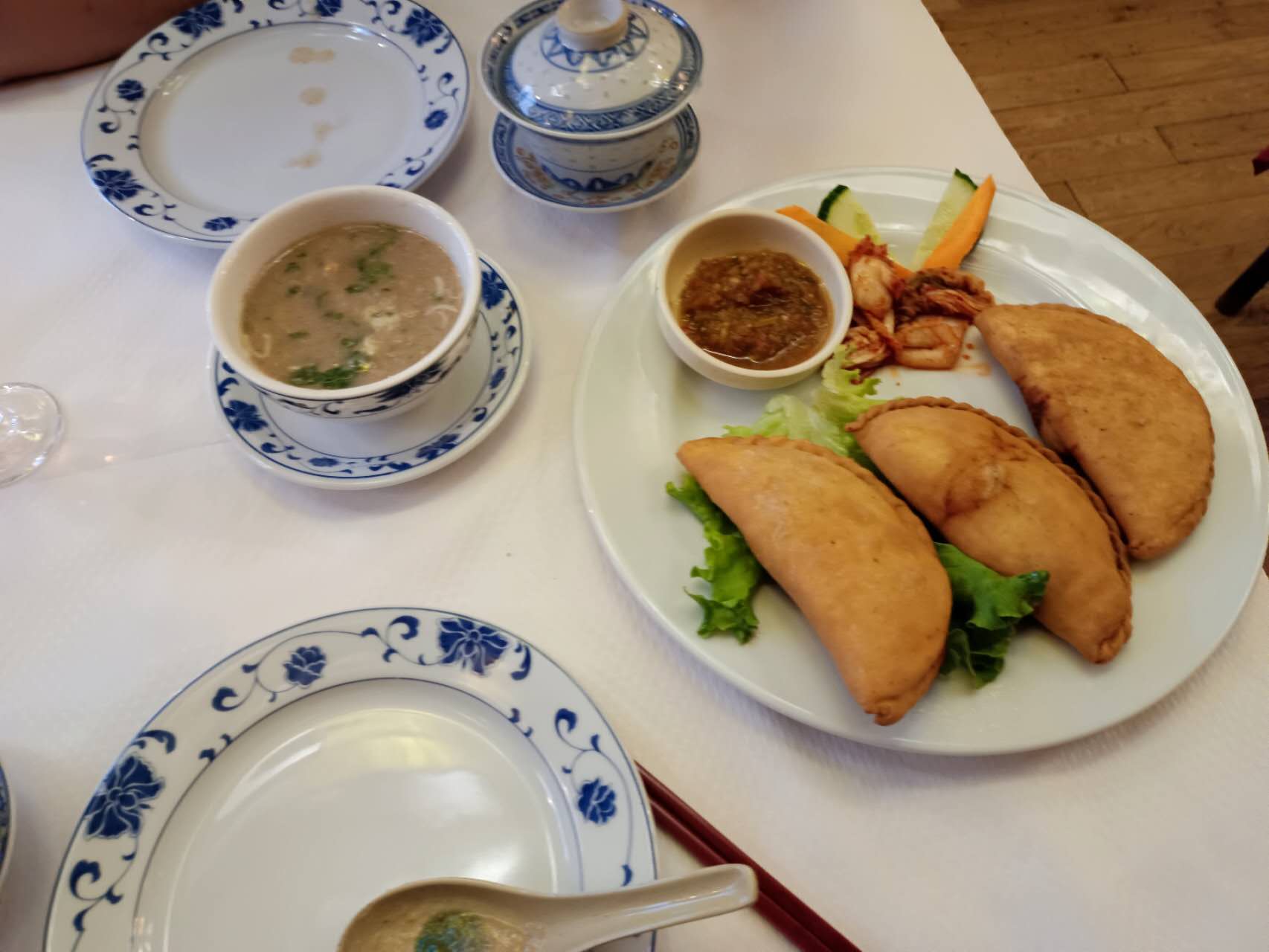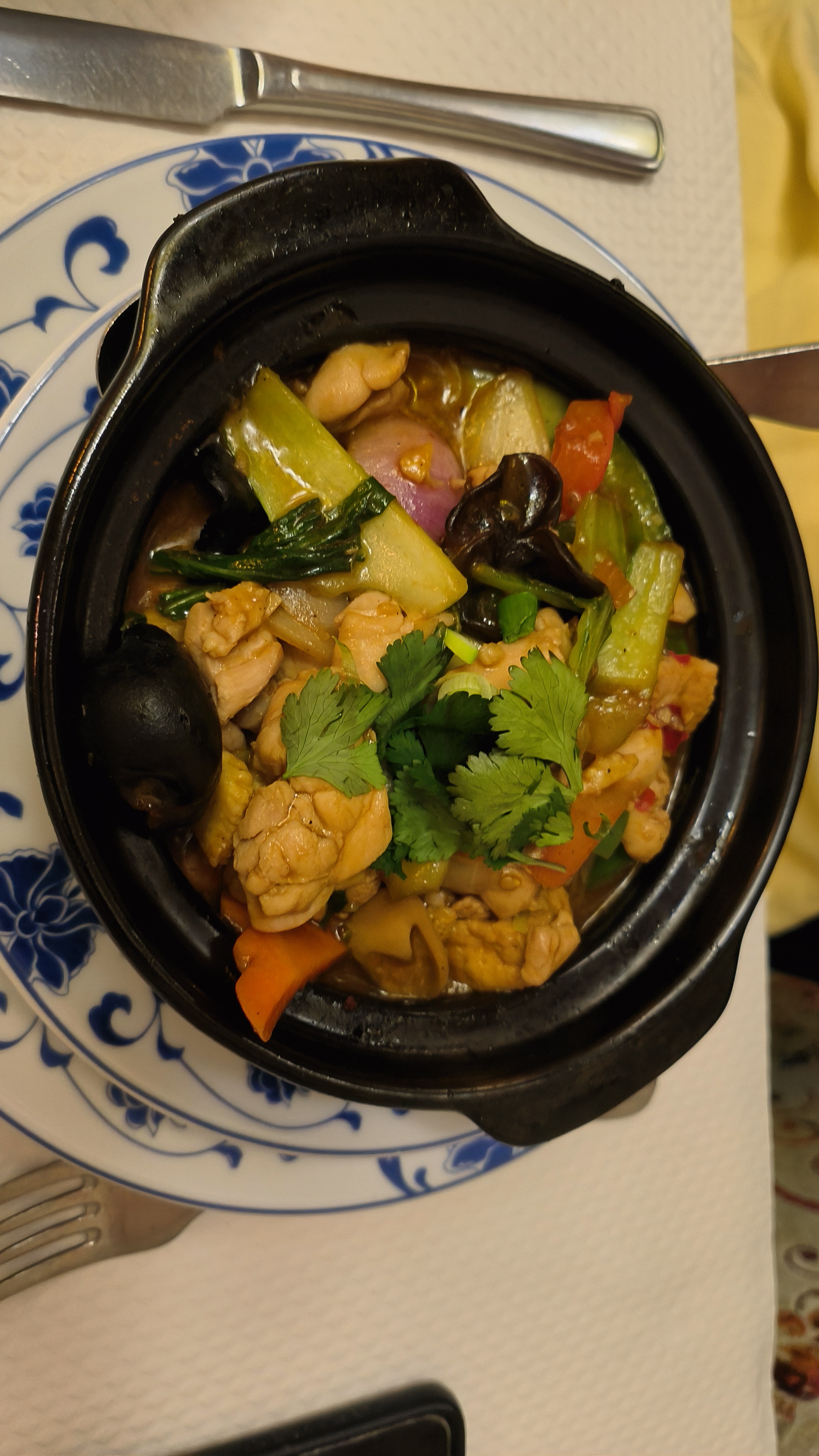 Déçue par le poulet sauté aux légumes pratiquement pas de blanc de poulet que de la peau et du gras de poulet avec oignons citronnelle et poivrons mais bien cuisiné et bien aromatisé dommage que la qualité des morceaux faisait défaut. De plus avons été servi en galettes aux légumes au lieu des galettes à la viande erreur du cuisinier et le thé maison était très sucré d'office.
