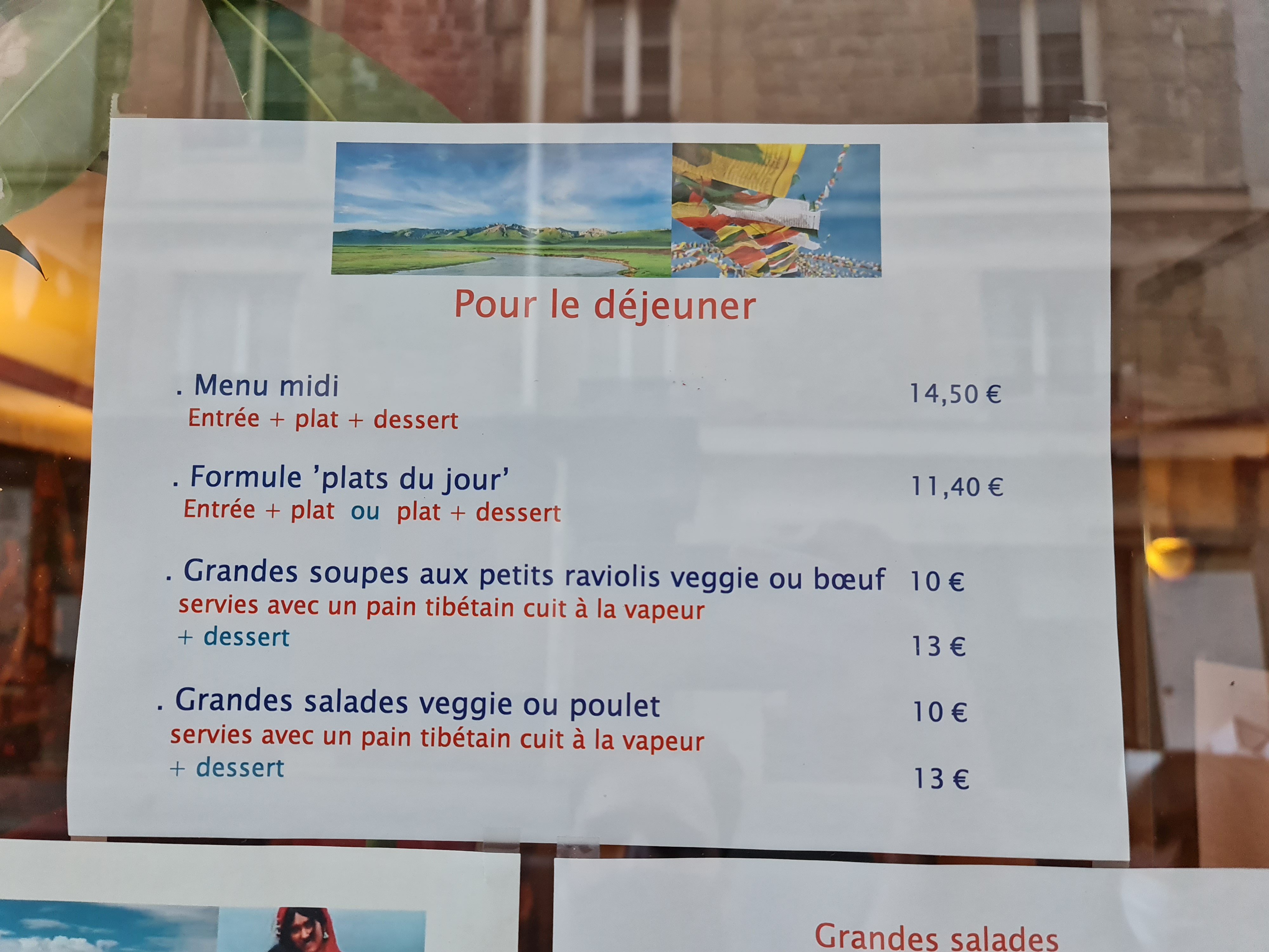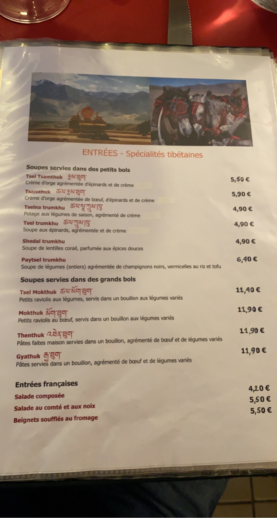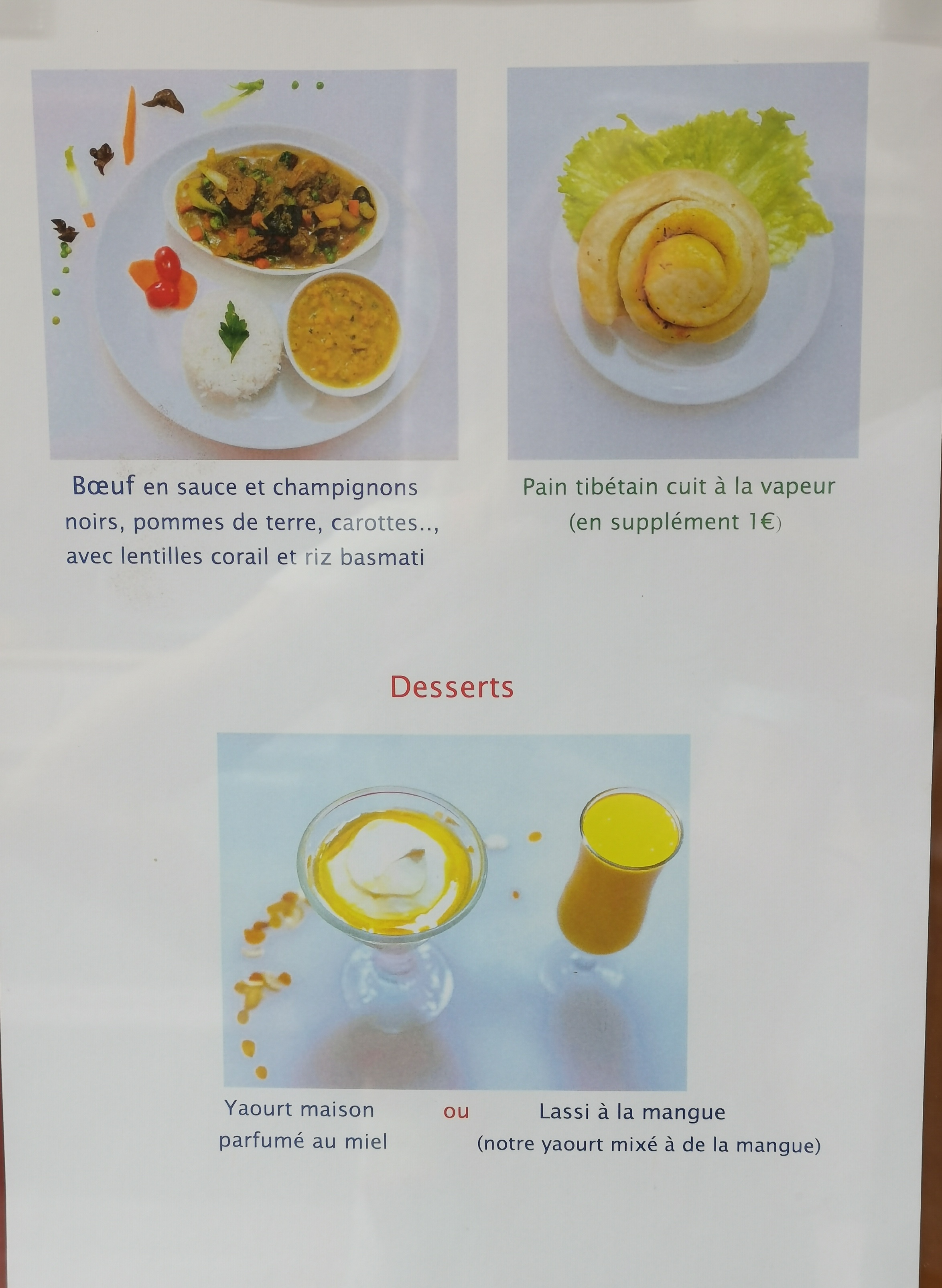 On a pris le menu du soir avec entrée une soupe traditionnelle en plats on a goûter les raviolis et le bœuf qui étaient délicieux ! Service très agréable, jolie cadre on se retrouve vraiment dans l’ambiance tibétaine. J’ai été en voyage la bas et ça m’a fait plaisir de ressentir cette ambiance.