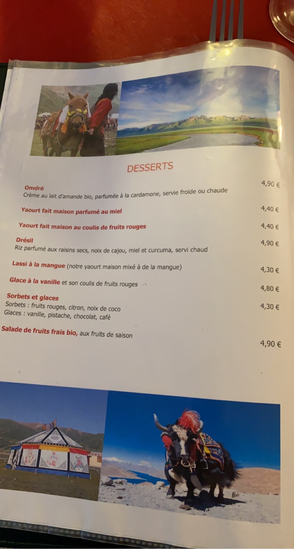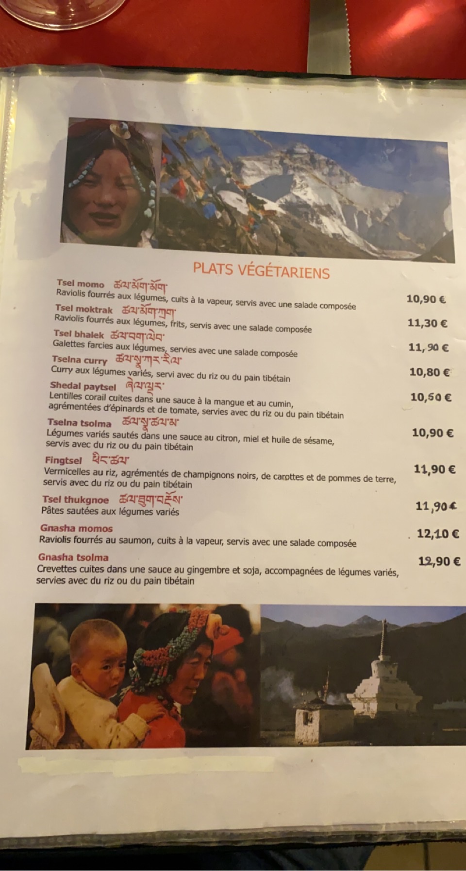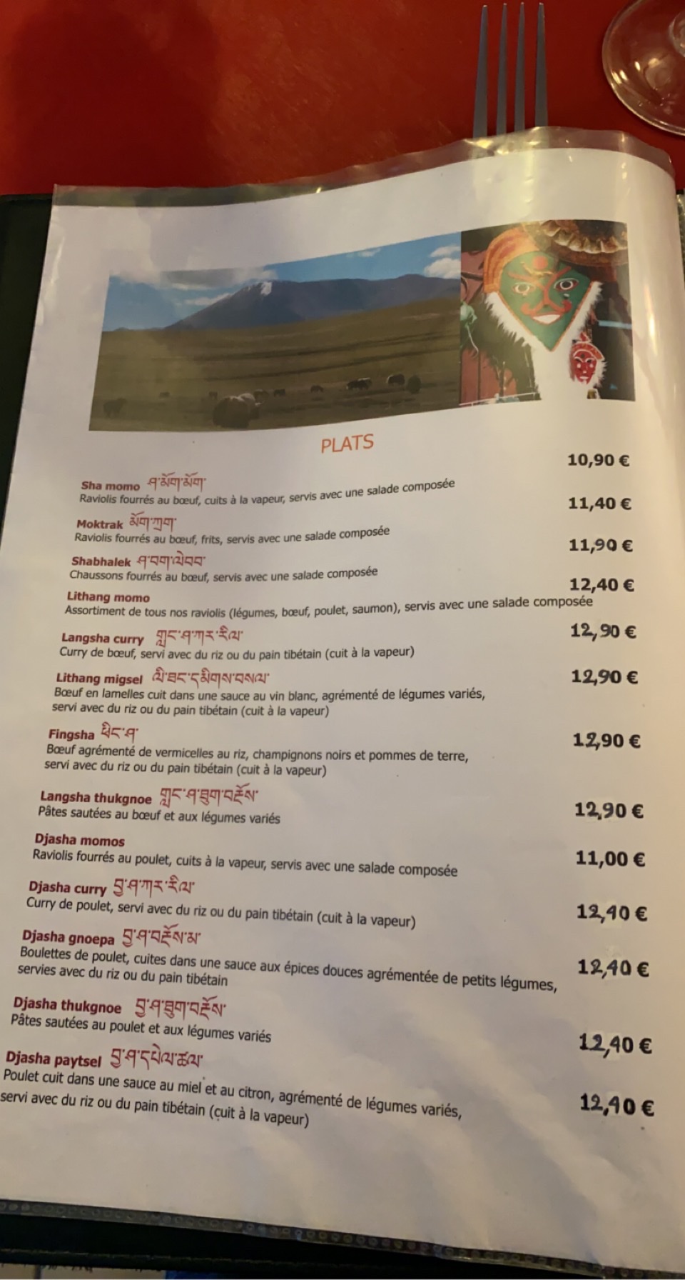 On a pris le menu du soir avec entrée une soupe traditionnelle en plats on a goûter les raviolis et le bœuf qui étaient délicieux ! Service très agréable, jolie cadre on se retrouve vraiment dans l’ambiance tibétaine. J’ai été en voyage la bas et ça m’a fait plaisir de ressentir cette ambiance.