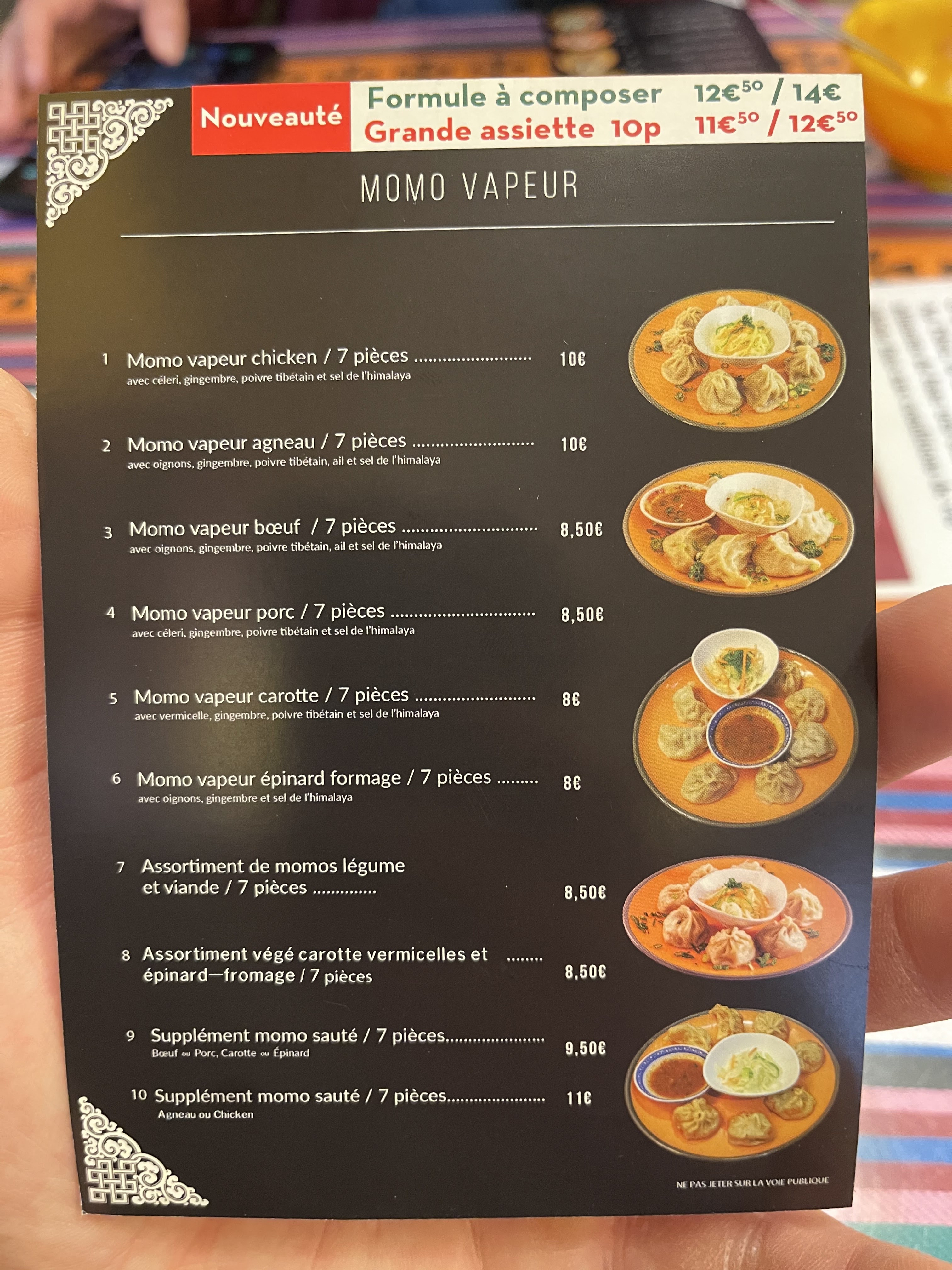 Rien d'exceptionnel dans l'assiette, lorsqu'on sait faire ses propres Momos, avec une vraie recette tibétaine : c'est bon, mais un peu cher ... L'ambiance est cependant amusante, les personnes présentes sympathiques. Évitez les jours humides ou venteux, car l'échoppe reste ouverte quelle que soit la météo !