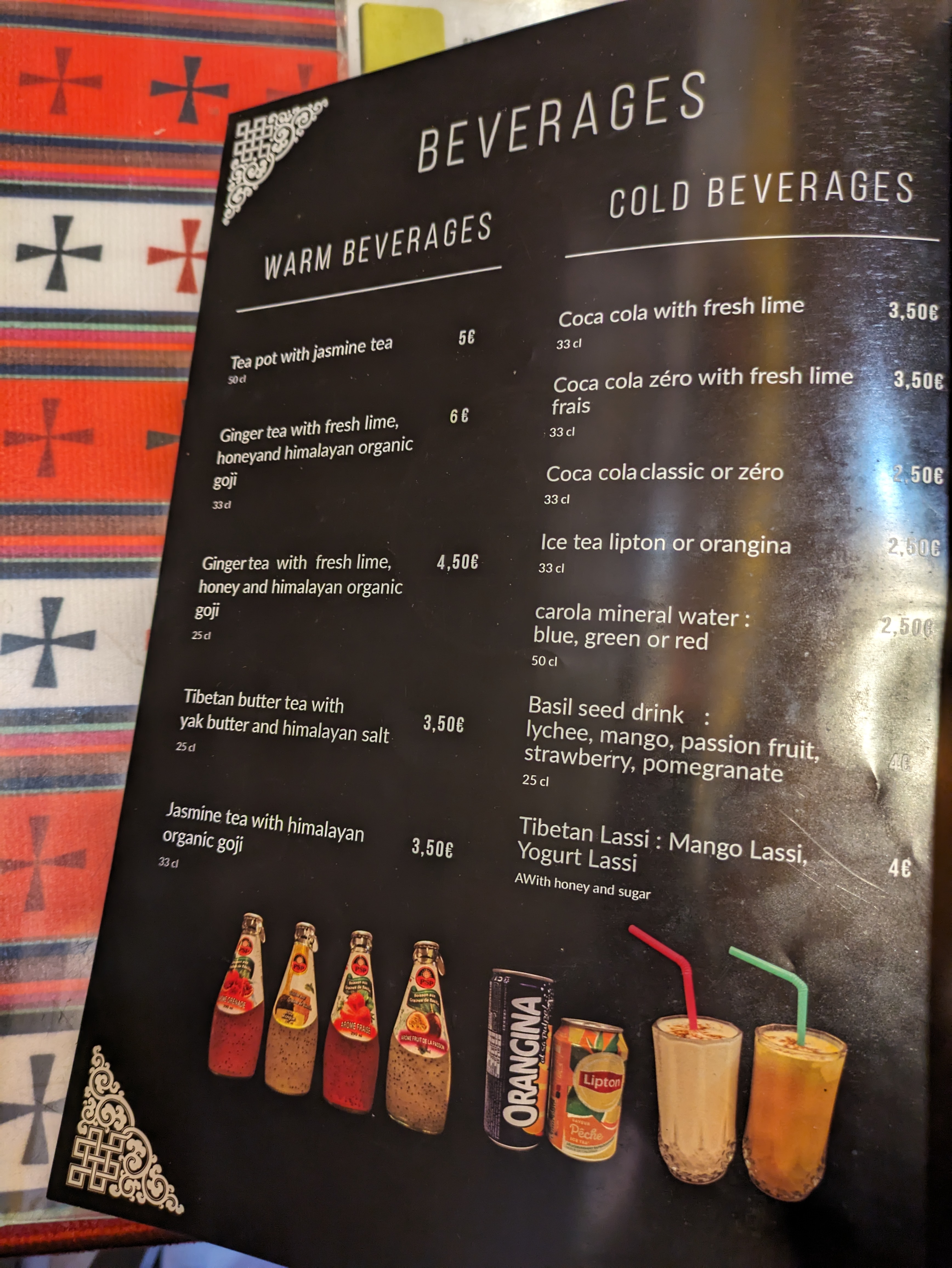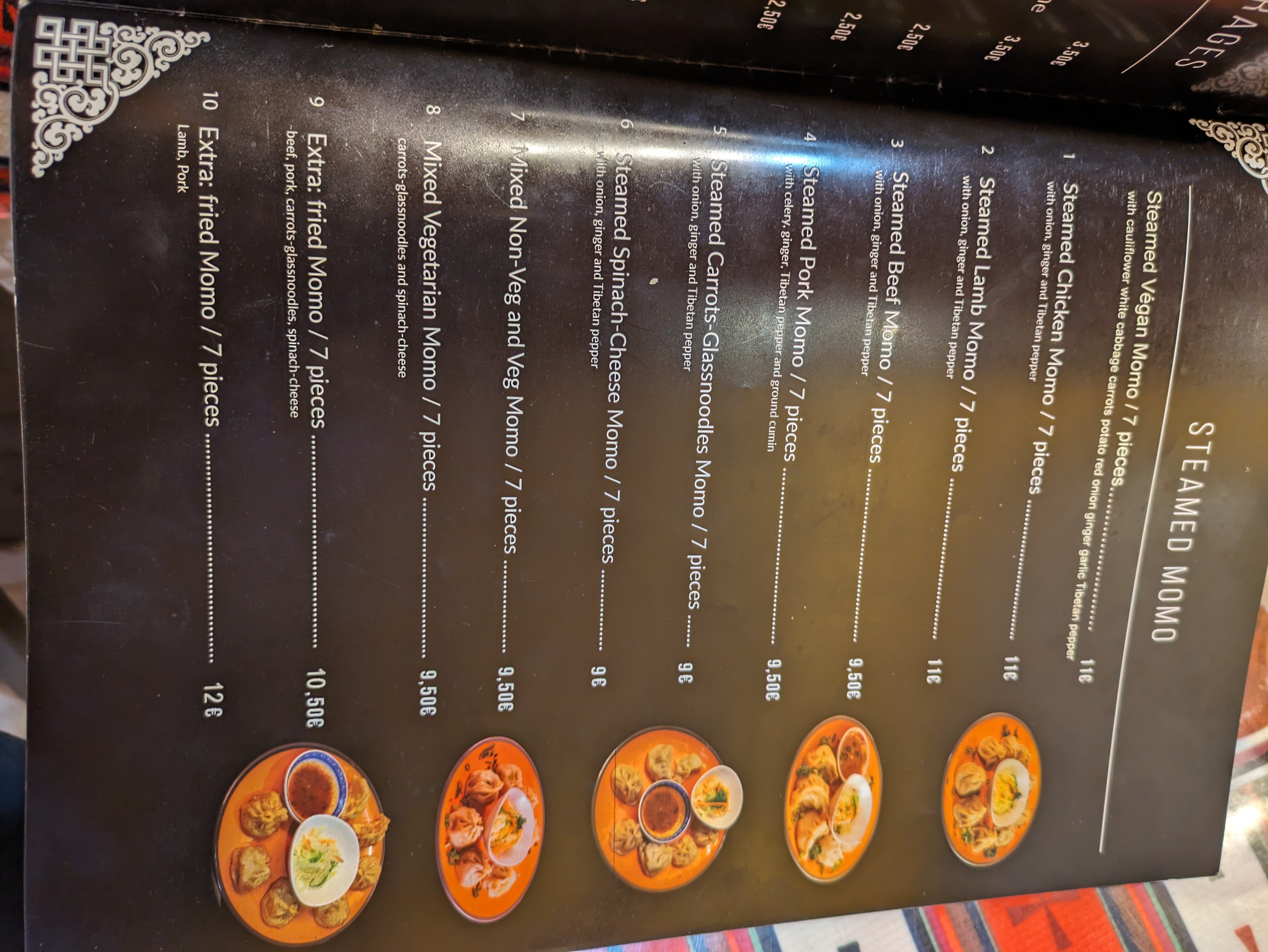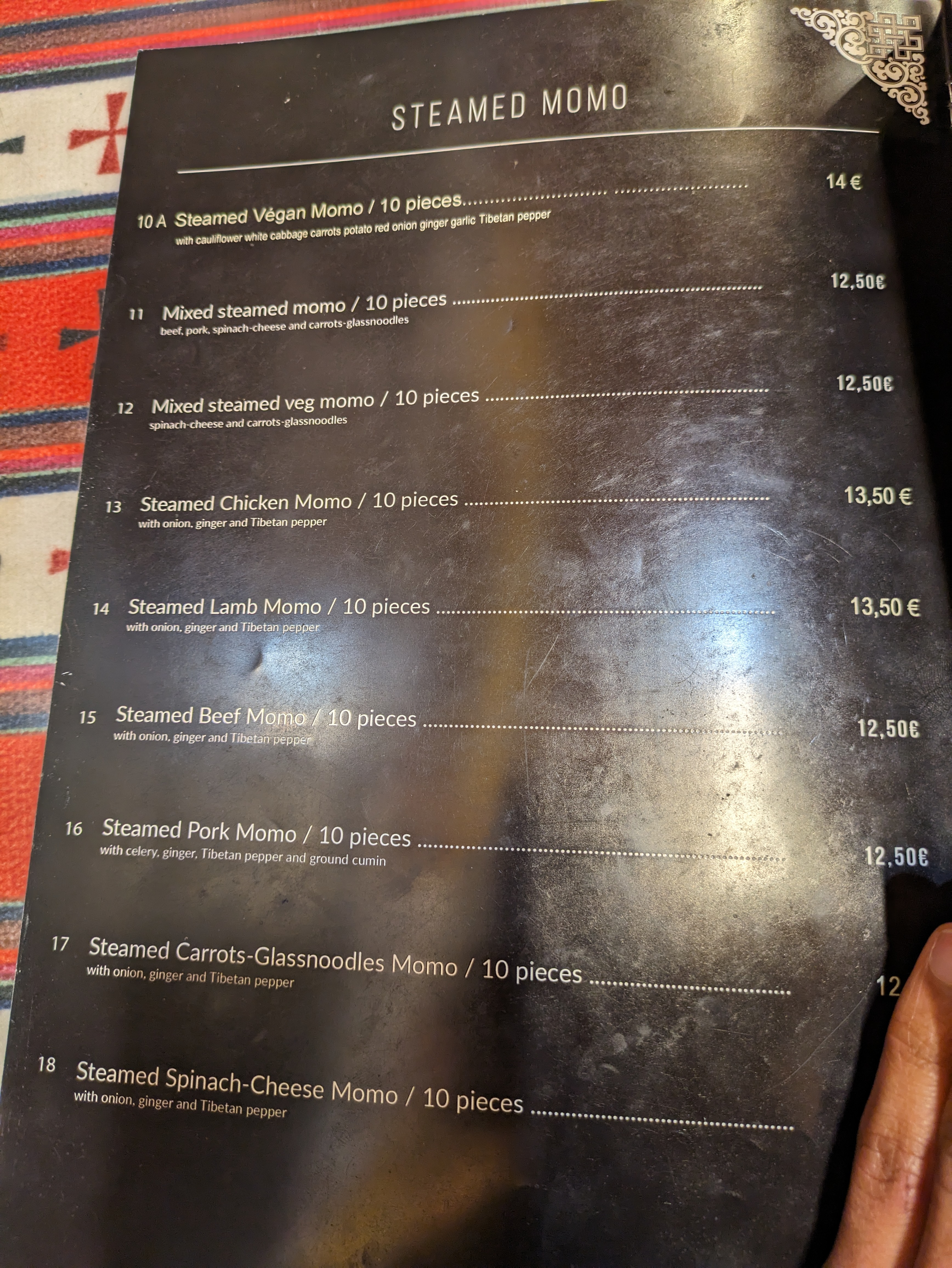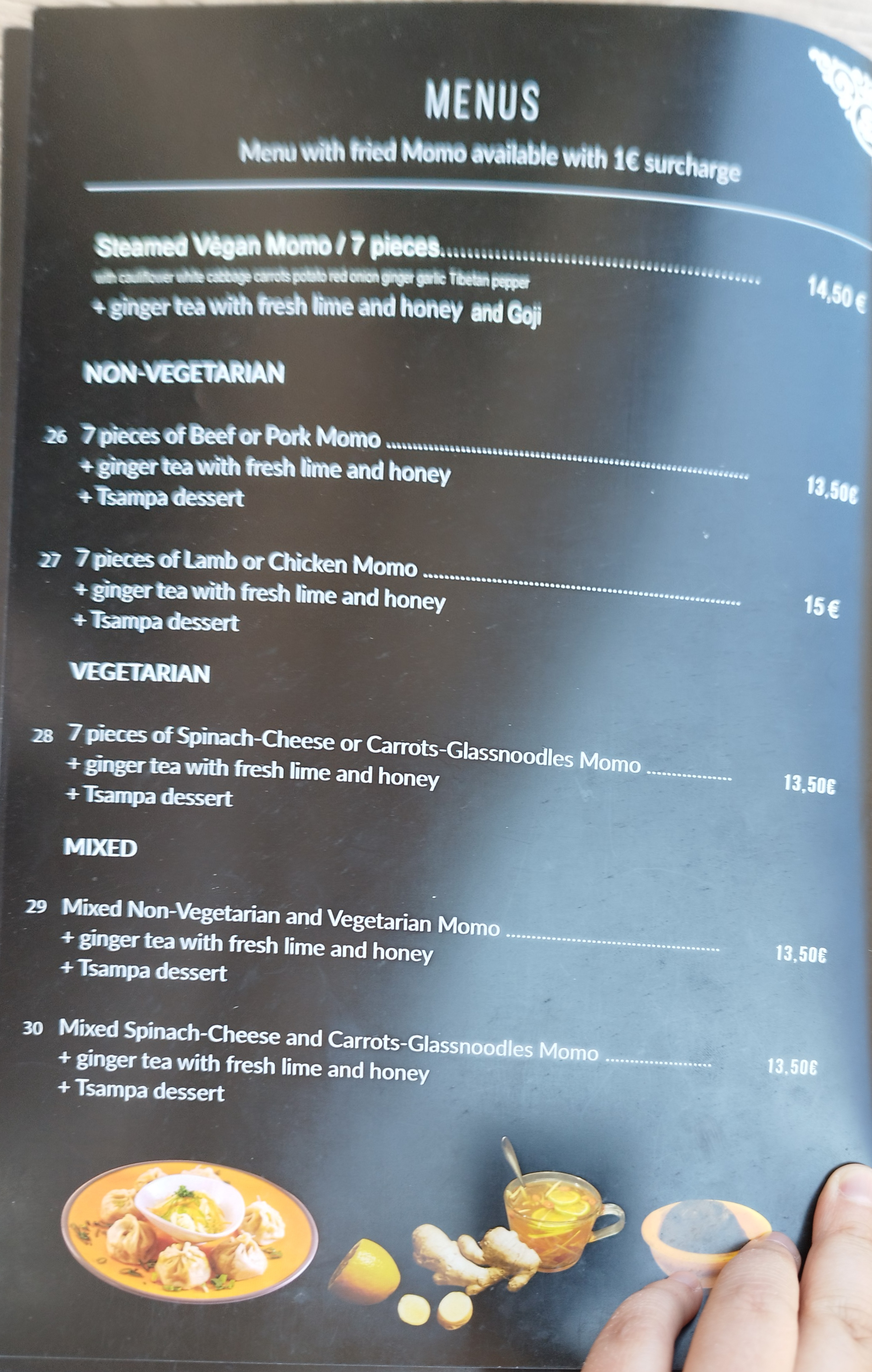 On m'avait recommandé ce restaurant et je n'ai pas été déçue. J'ai choisi les momos sautés vegans et ils étaient délicieux ! J'ai payé 16€ pour 10 momos et le plat était copieux. Le restaurant est tout petit mais cela fait du charme. NB : Je n'ai malheureusement pas pu prendre un menu car le thé proposé comprenait du miel. Ce serait sans doute utile de proposer un thé sans miel pour les vegans.