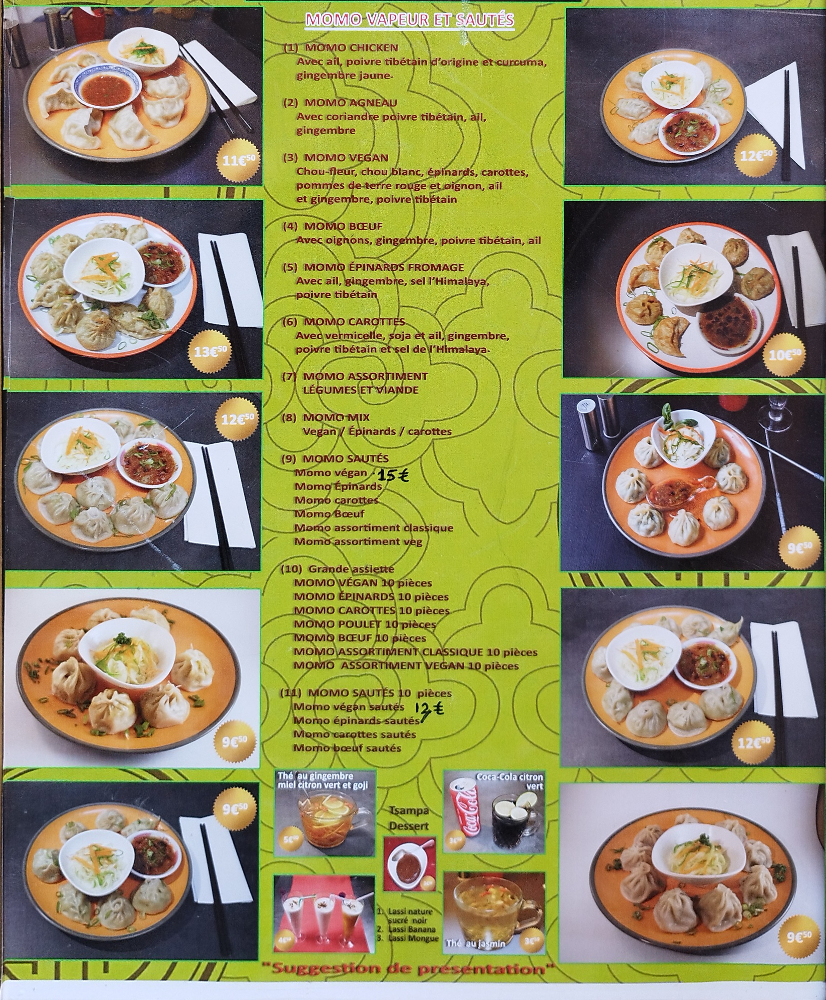 Tashidelek 😊 (Bonjour, en tibétain) Atypique et délicieux, les MOMO TIBÉTAIN sont de 7 ravioles de boeuf, porc, épinard fromage, légumes ou assortiment de chaque. Ses boissons chaudes tels : thé tibétain au beurre salé, thé noir au gingembre miel citron, thé au jasmin. Ses boissons froides : aux graines de Basilic, fraise, Litchi, fruits de la passion, grenade, mangue Son dessert Tsem Pa (moitié farine de blé, moitié farine bio d'orge grillé, chocolat au lait, fleur d'oranger, sucre brun).
