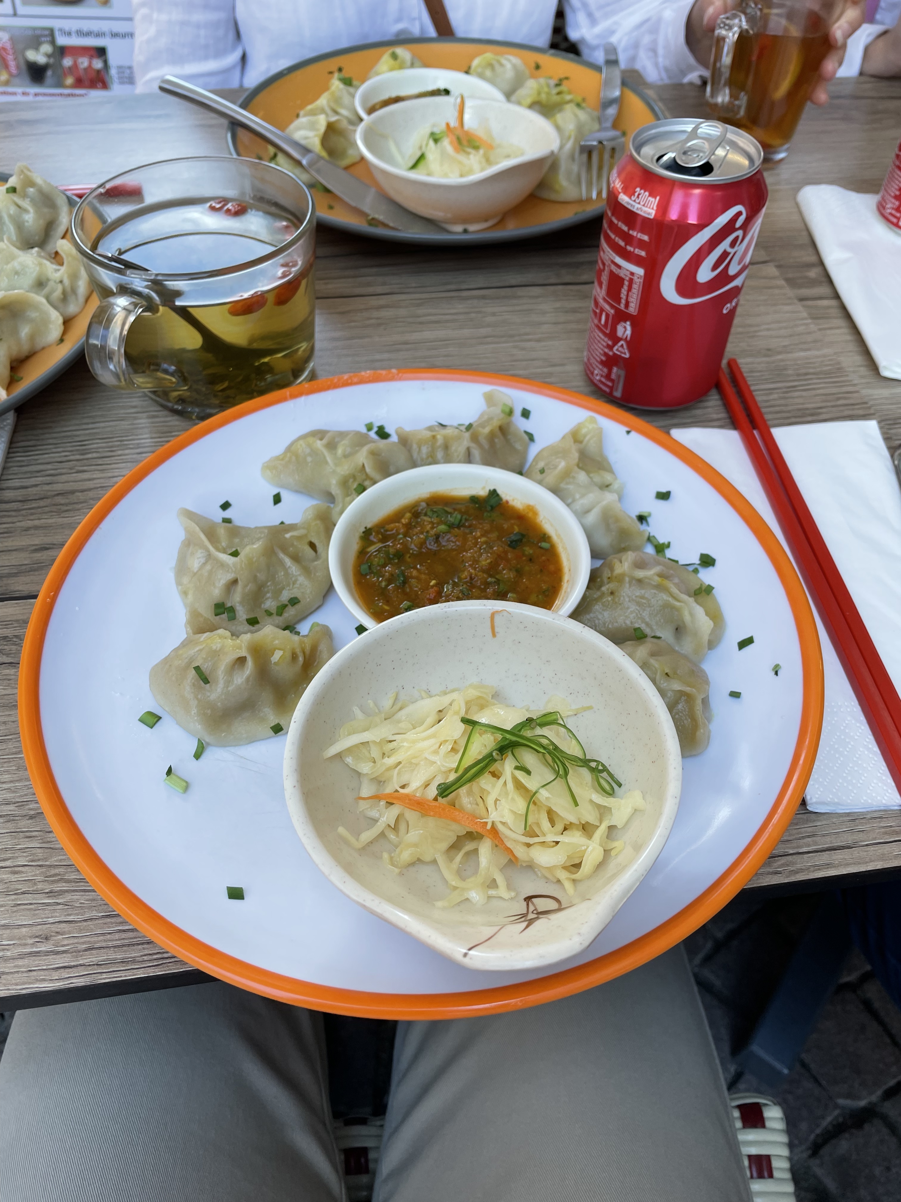 Nous avons pris des momos vapeur à l'agneau qui sont accompagnés d'une salade de chou et une sauce délicieuse, une Kirin et un thé au (gingembre, citron vert frais, miel et bais de goji de l'Himalaya) vraiment délicieux et le petit dessert tsampa. Ça nous a donné envie de revenir pour goûter les momos végétariens aux épinards et des momos sautés. Ne paye pas de mine de l'extérieur mais vous ne serez pas déçu. Attention petite terrasse.