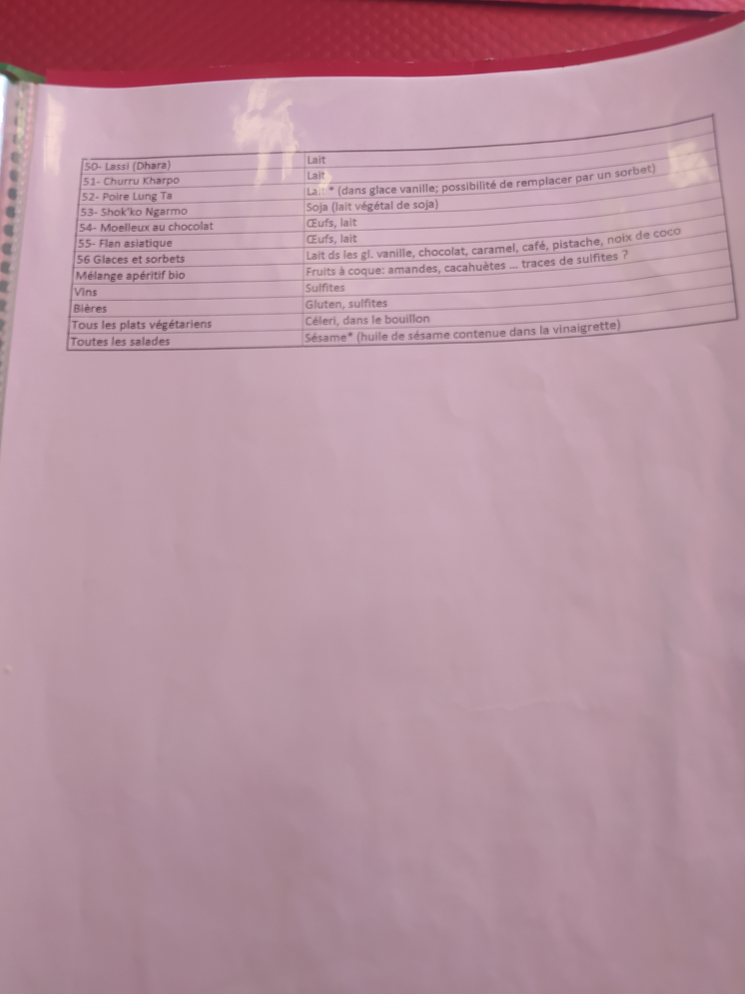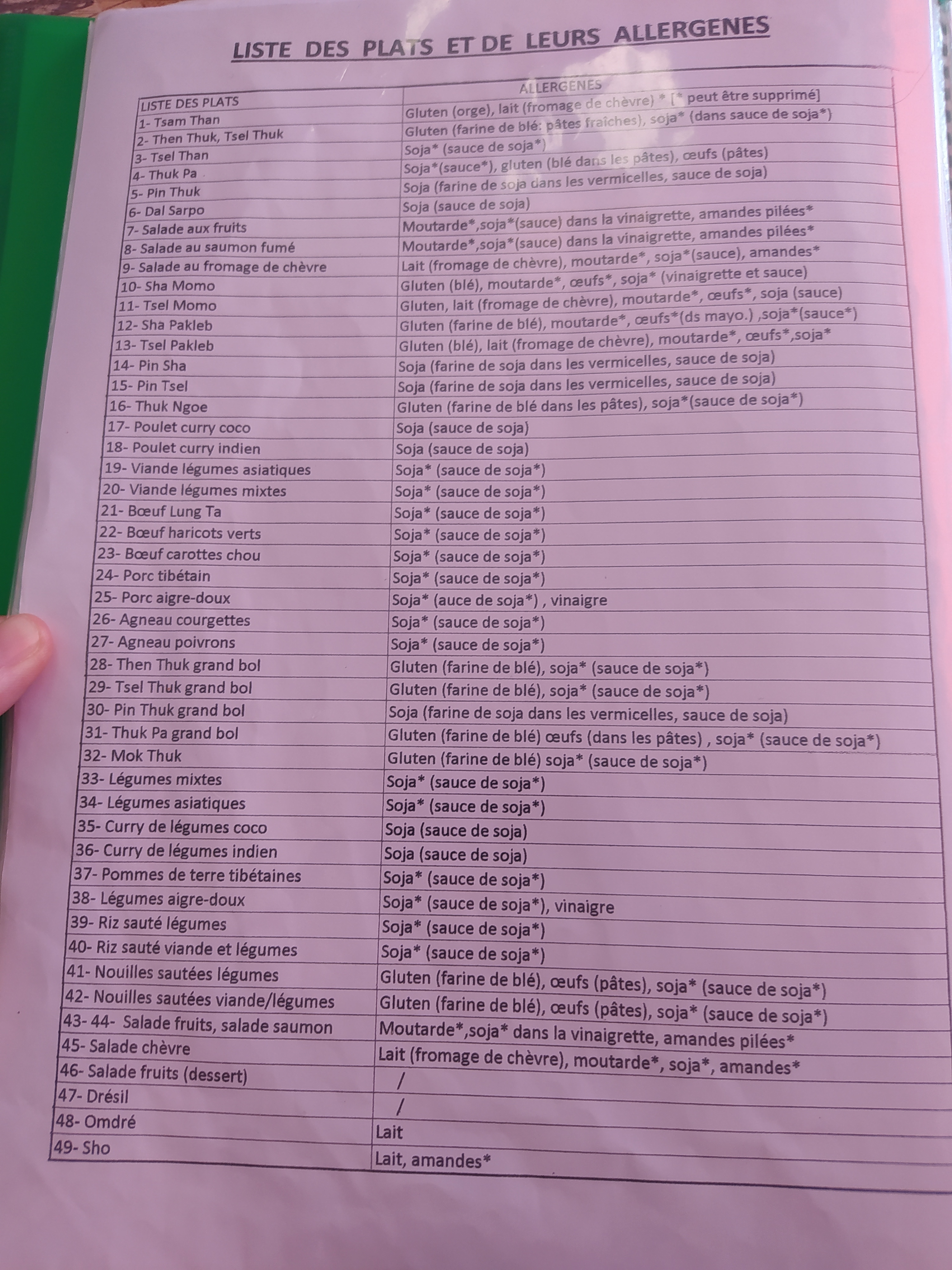 Pour une première découverte de la cuisine tibétaine notre famille a été complètement séduite. Les plats sont délicieux et le personnel charmant. A recommander. De plus, à la fin de la carte, avant la partie en anglais, il est noté pour chaque plat les allergènes contenus.
