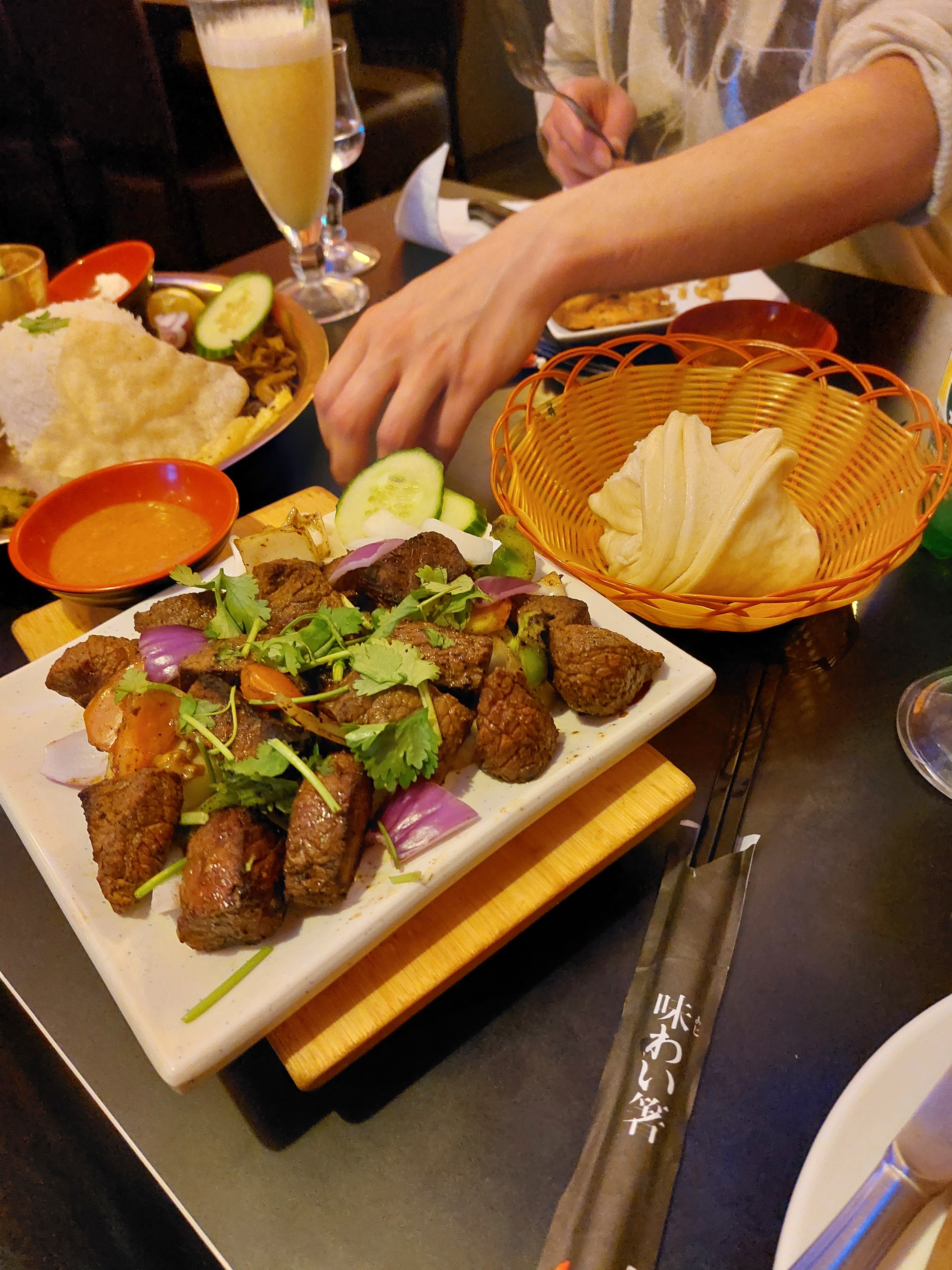 Premiere specialité nepalaise/tibetaine pour moi. Service souriant. Entrée au boeuf bien assaisoné (herbes et epices). Plat principal à la chevre accompagné de riz (excellent) et plein de petits plats sur le coté (legume, patates, soupe de pois chiche, fromage (de chevre?) ) Je recommande !