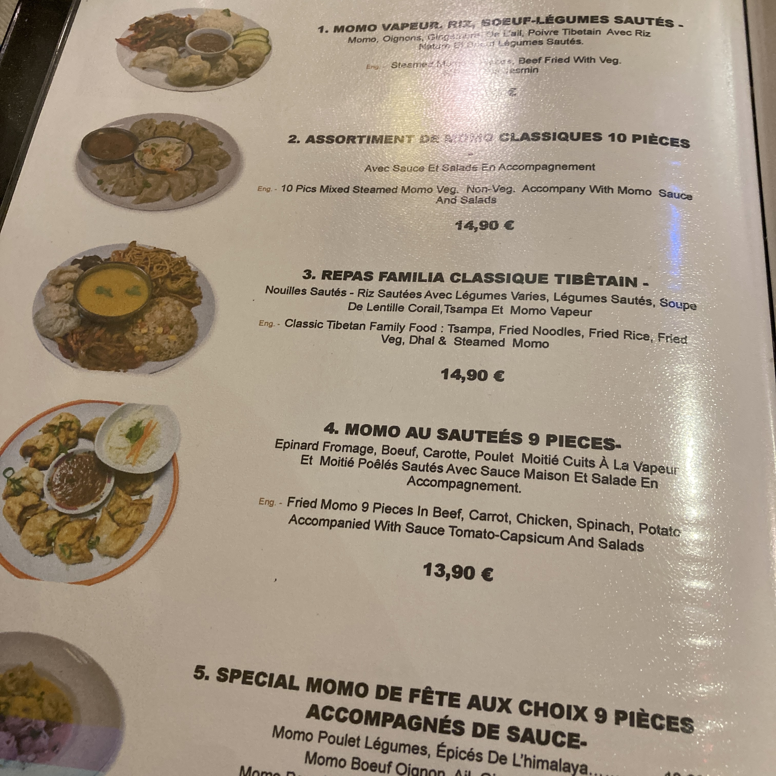 Super service très aimable et souriant, plats tibétains très savoureux, attention copieux. Pensez à réserver, le grand restaurant ne l'est pas beaucoup plus que momo tibétain grande rue. N'hésitez pas à choisir les plats du soir ou des assortiments qui vous permettront de goûter plusieurs spécialités